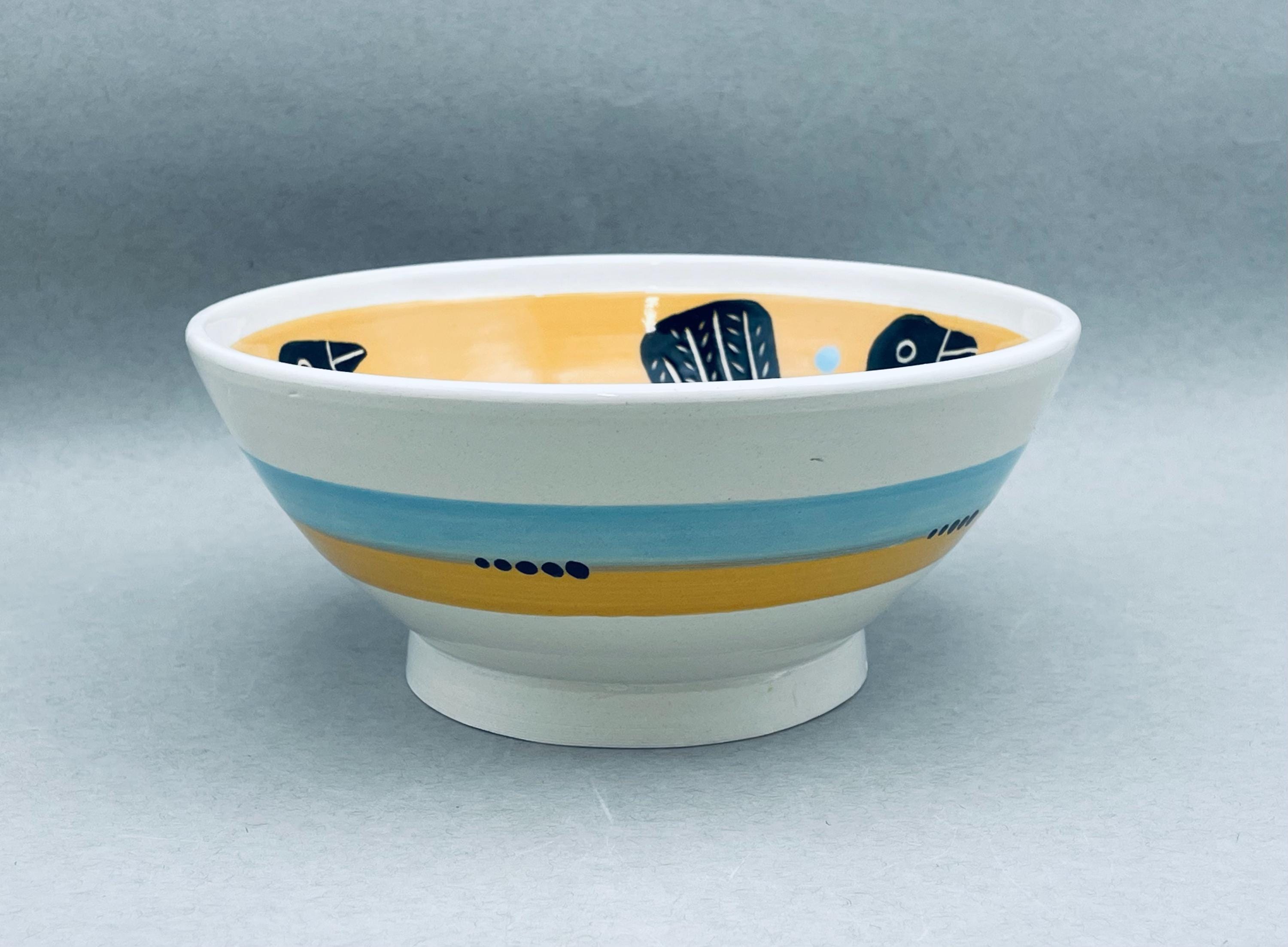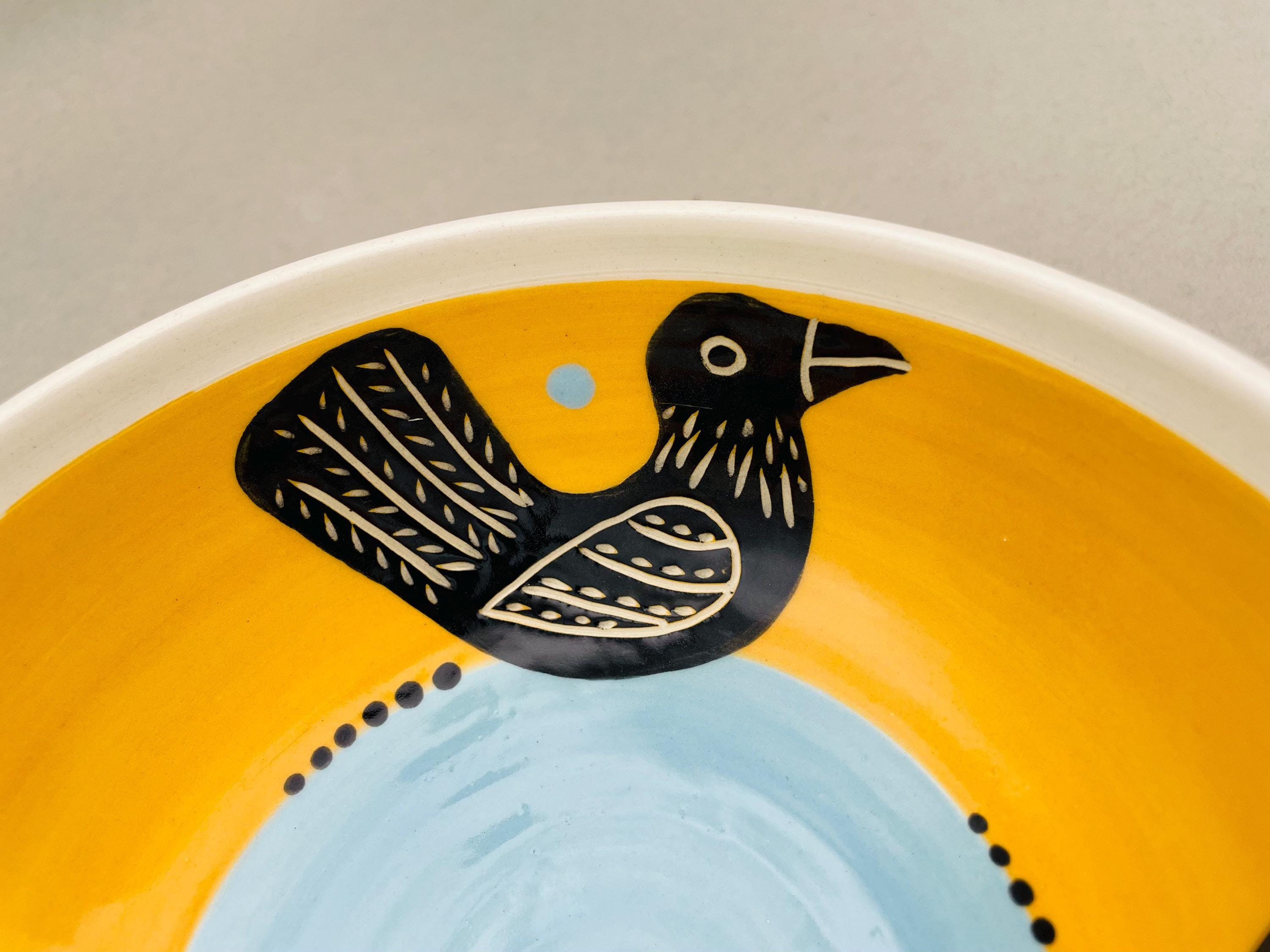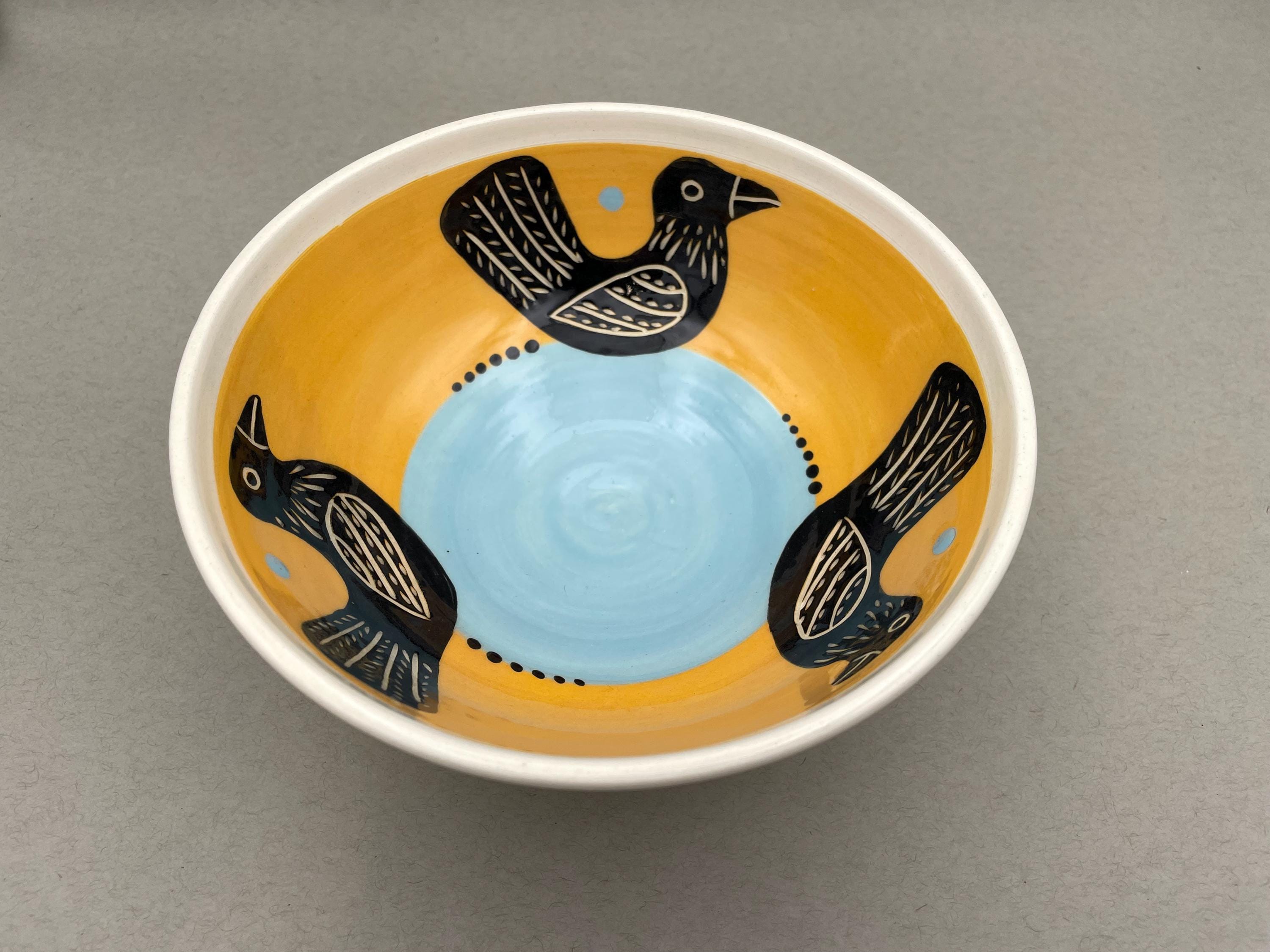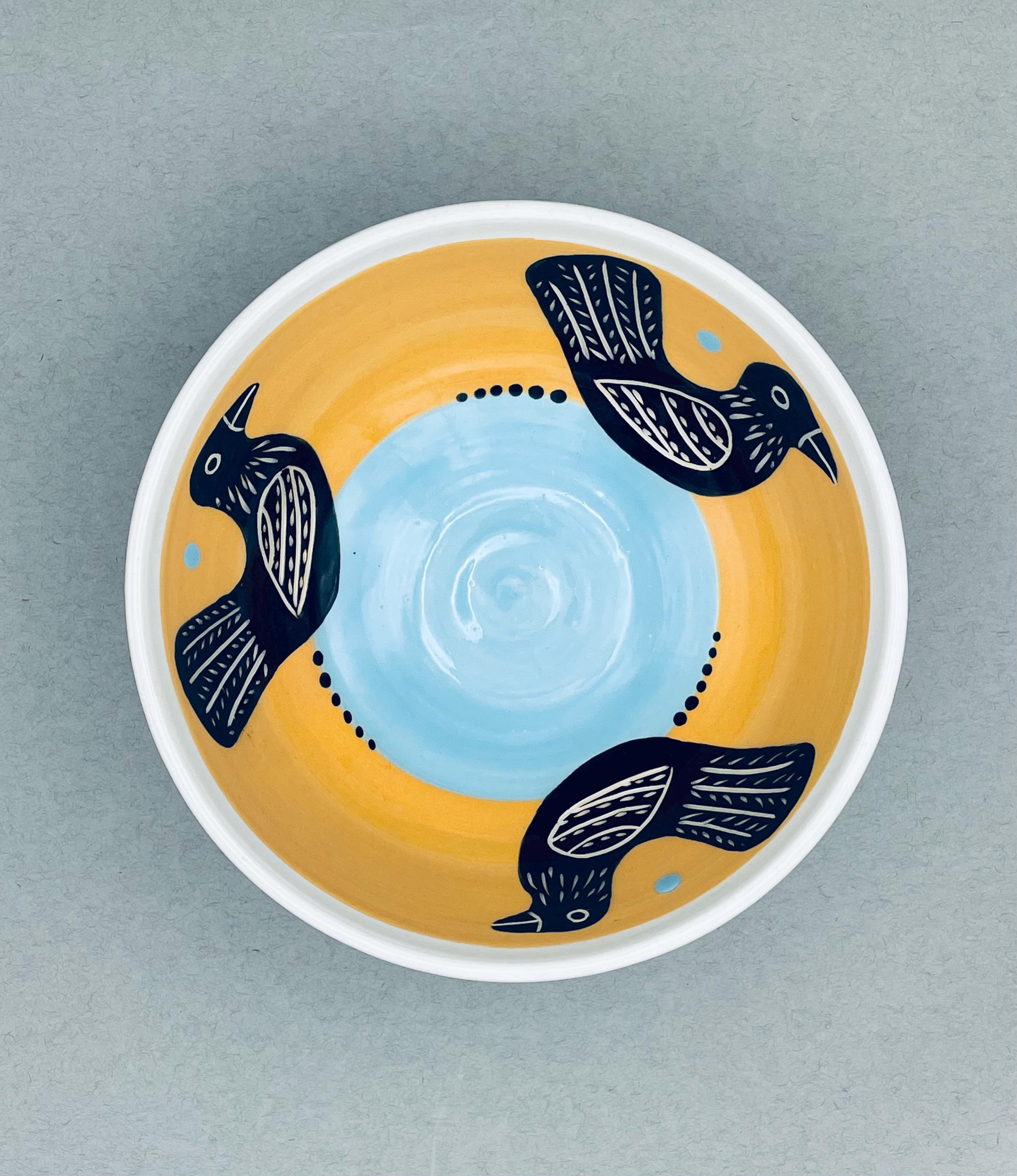 Maybe these three blackbirds are waiting for the other 21 to show up? It's dainty dish nonetheless! Colorful bowl for cereal, personal salad, salsa, side dish. Going for a folksy woodcut look here. The small foot gives this bowl a bit of a lift.