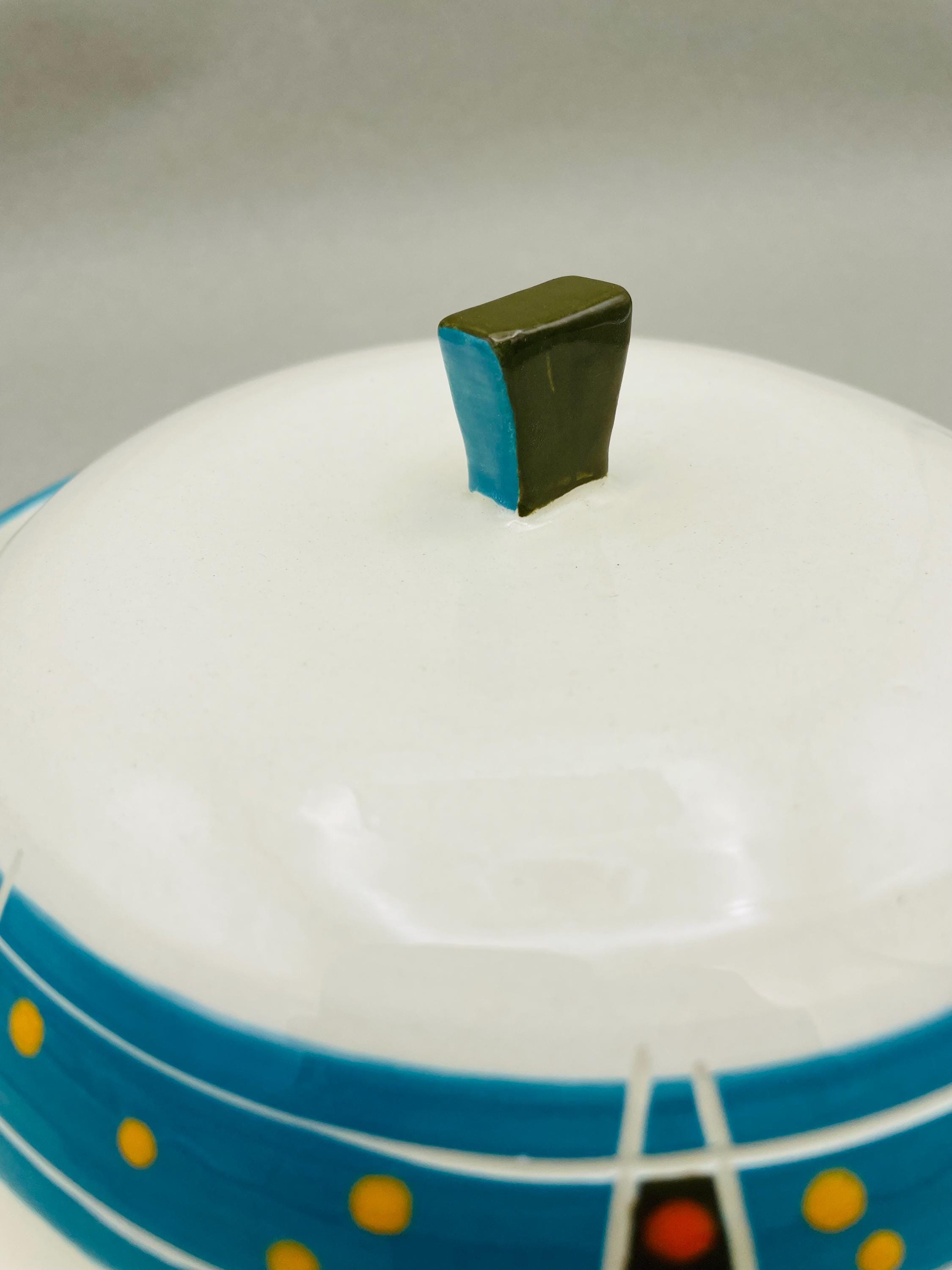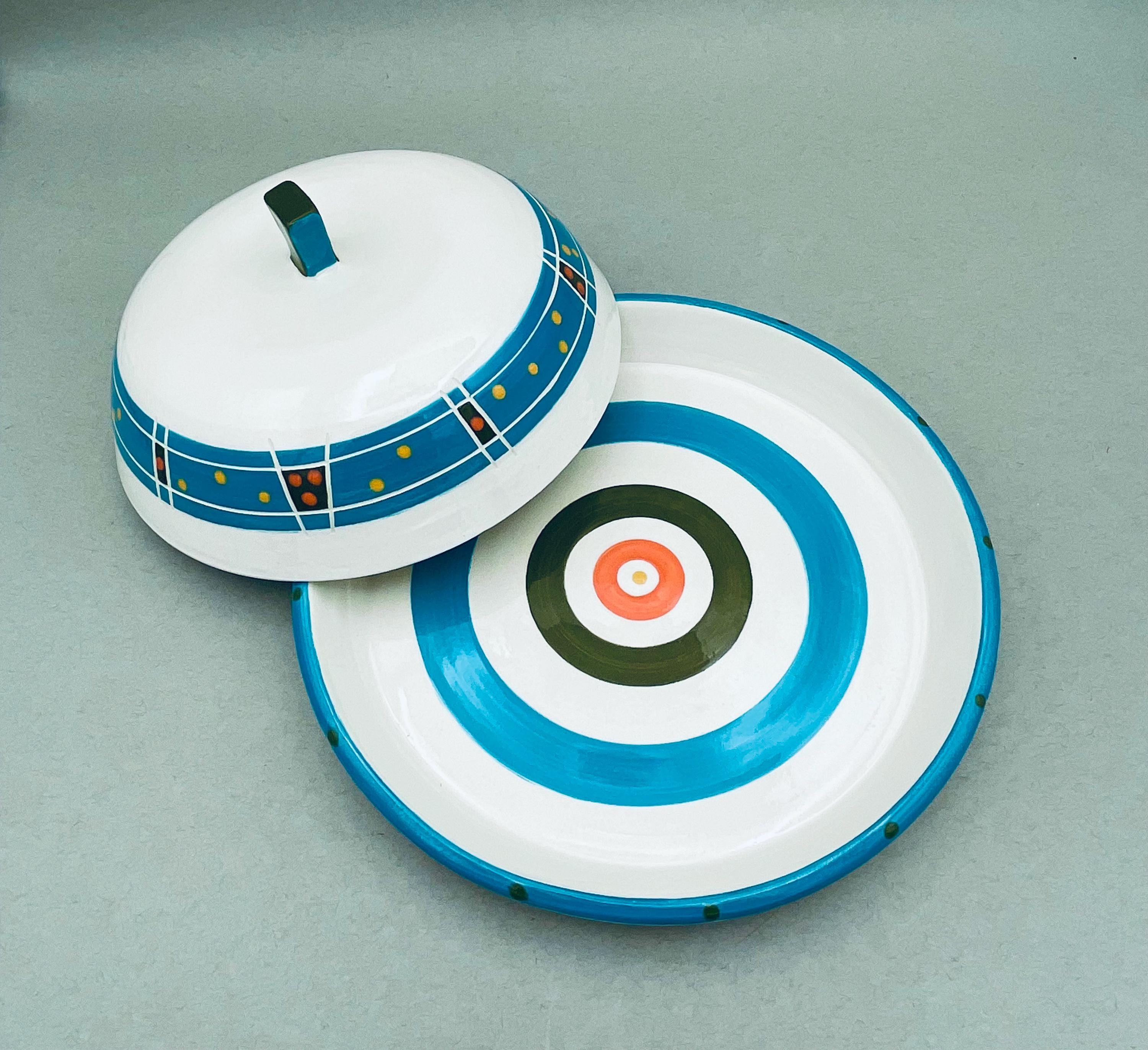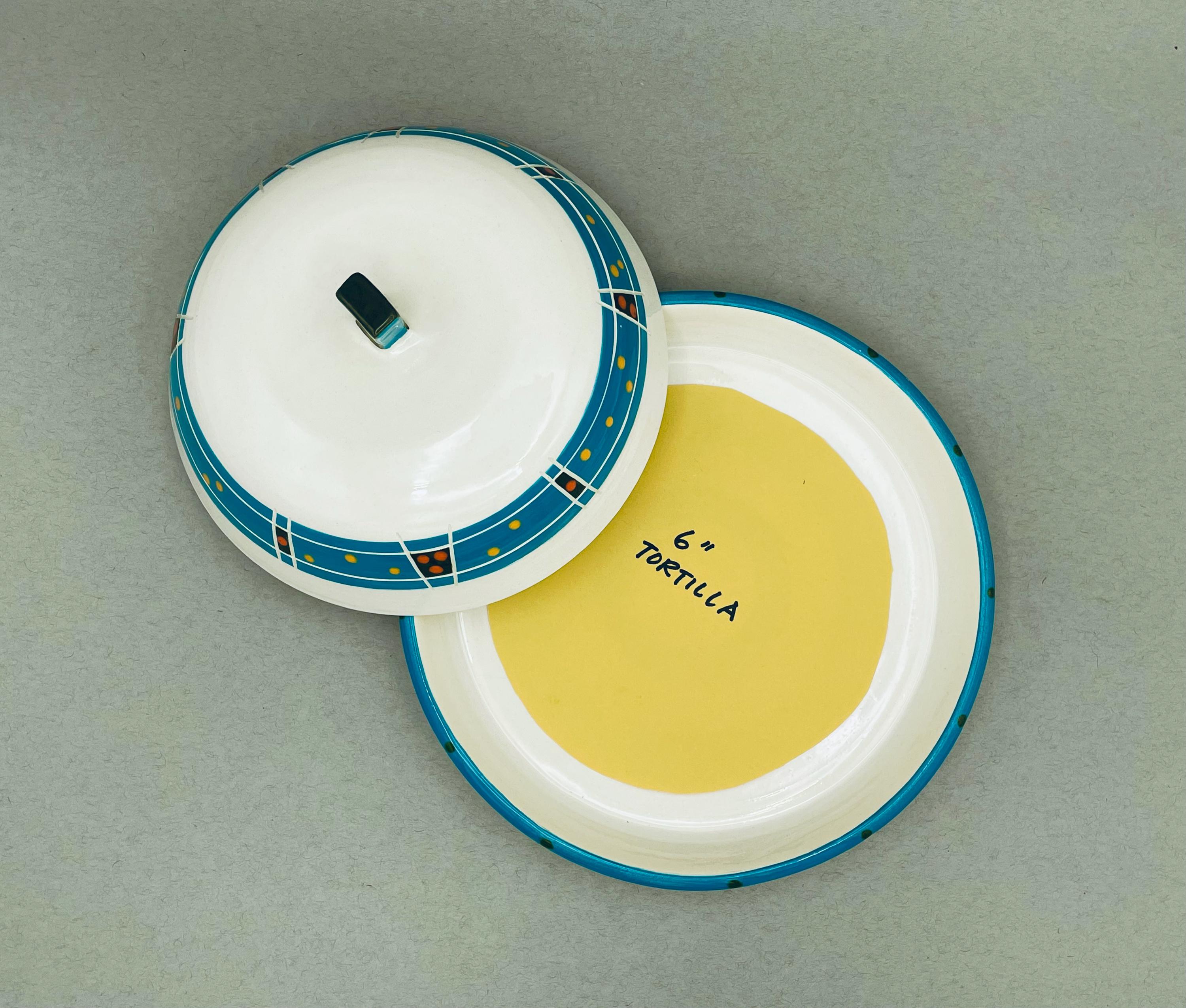 The geometric design in deep turquoise, olive, orange and gold echo the sensibilites of Mid Century aesthetic. Heat your tortillas or your meal in this freshly made throwback!
